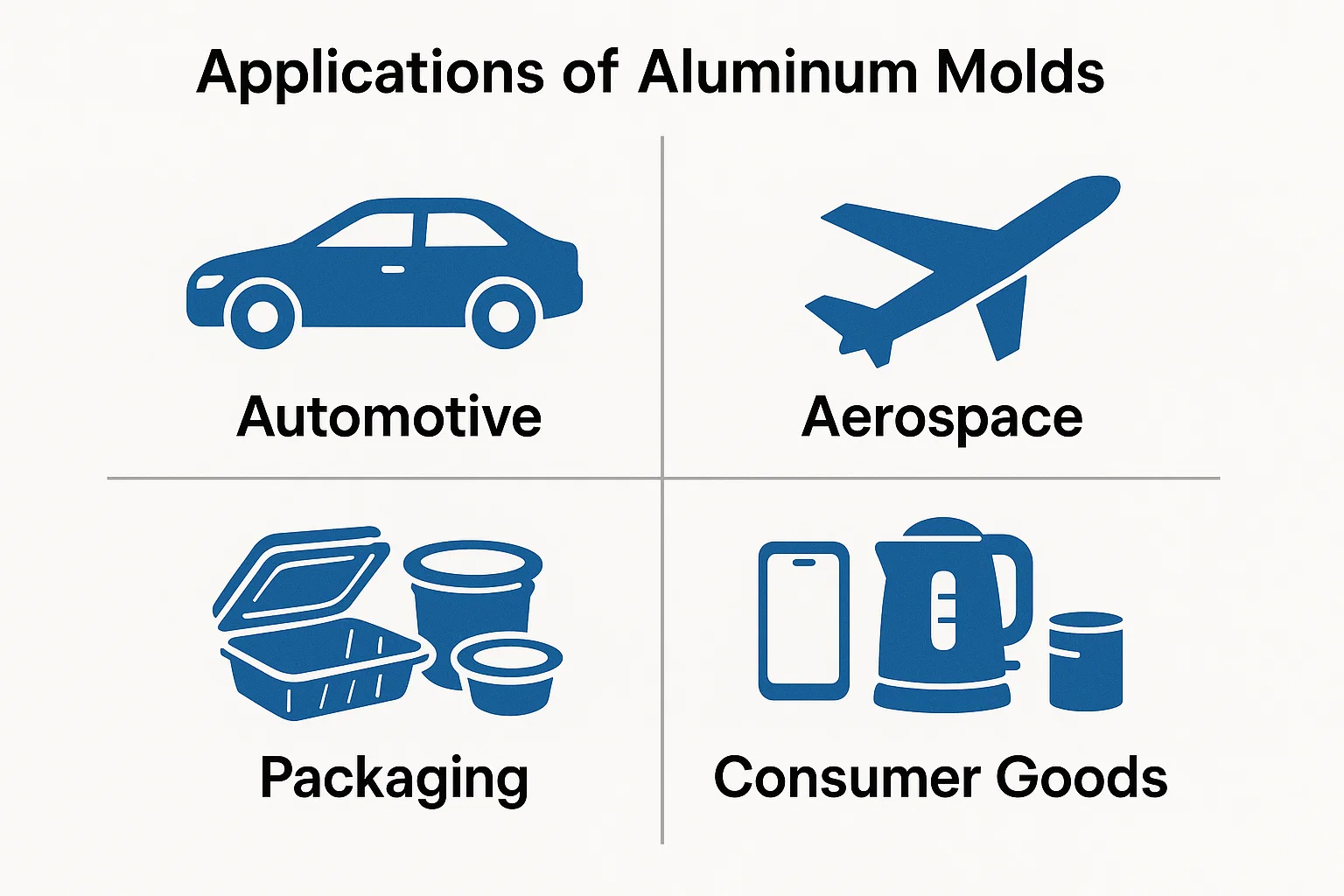 لقد وجدت قوالب الألومنيوم طريقها إلى مجموعة متنوعة من الصناعات ، مدفوعة بالحاجة إلى عمليات تصنيع أسرع وأكثر فعالية من حيث التكلفة وقابلة للتكيف. خصائصها الفريدة تجعلهم خيارًا مفضلاً للشركات التي تتطلع إلى تبسيط الإنتاج وجلب منتجات جديدة إلى السوق بسرعة.