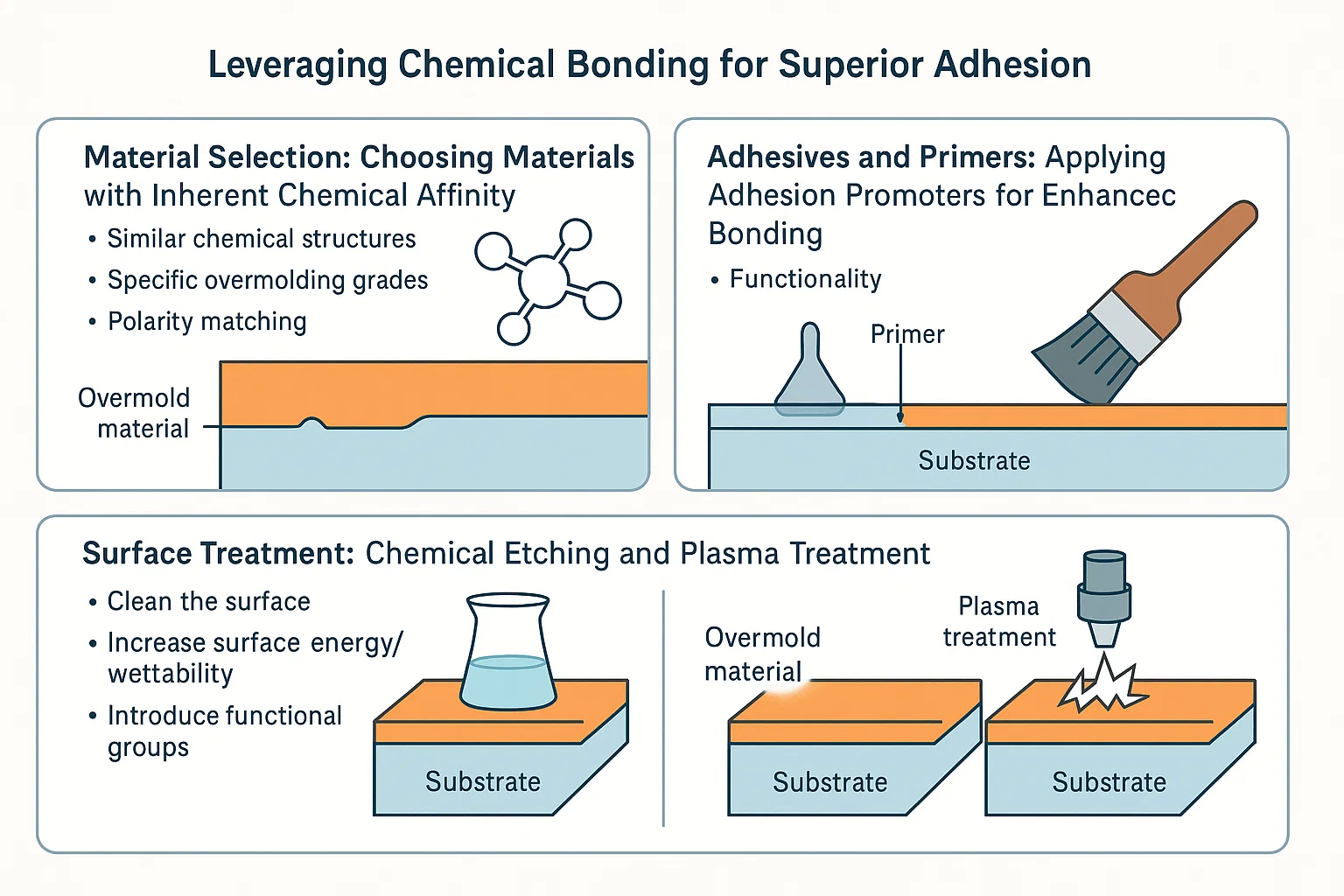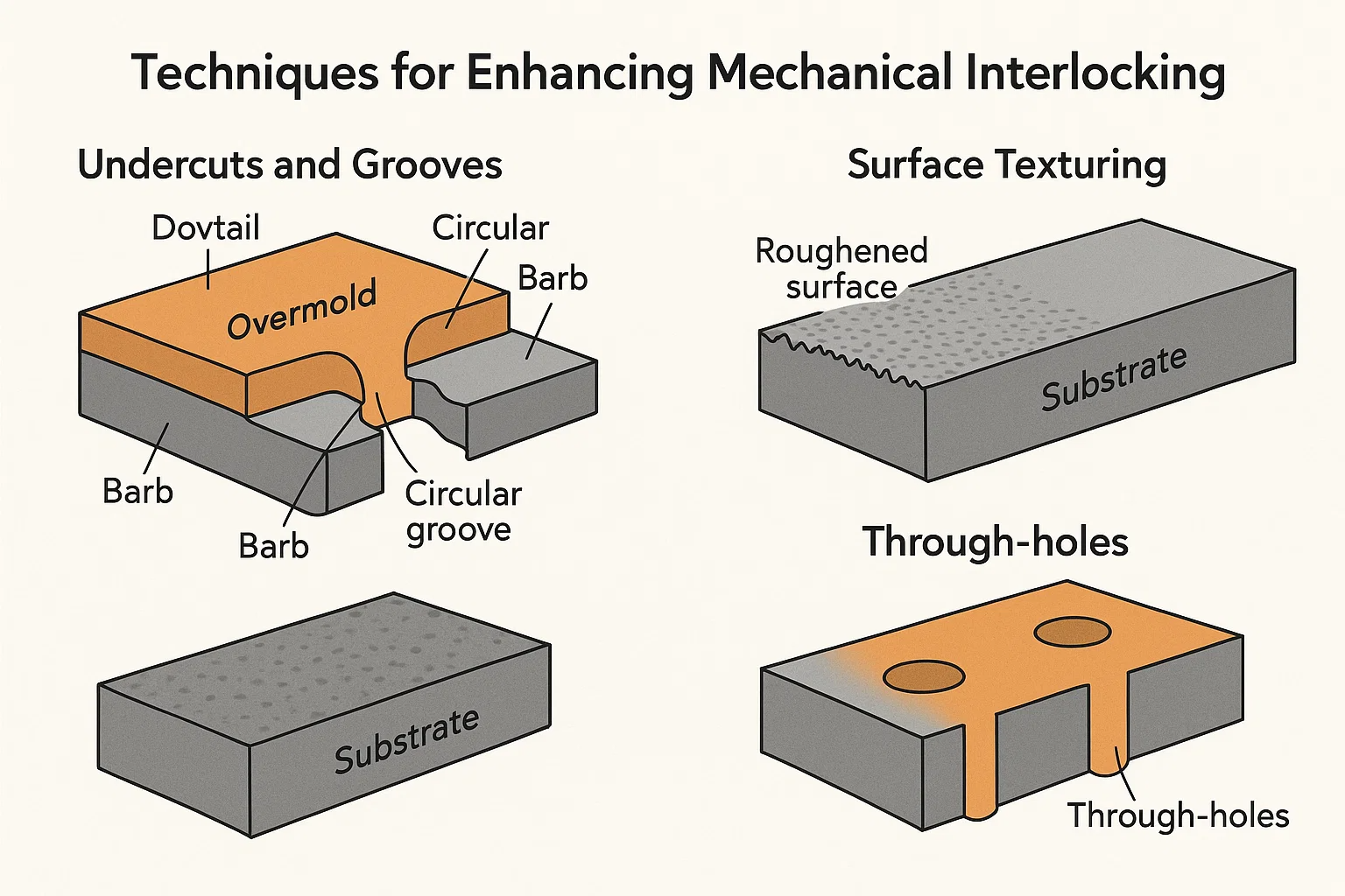 الحفر الميكانيكي/النسيج: يمكن أن يعزز إنشاء سطح خشن مجهري على الركيزة بشكل كبير المتشابكة الميكانيكية . يمكن تحقيق ذلك من خلال تقنيات مثل الرمل ، حفر الليزر ، أو حتى عن طريق تصميم النسيج مباشرة في قالب اللقطة الأولى. توفر مساحة السطح المتزايدة أيضًا المزيد من النقاط للتفاعل الكيميائي المحتمل.