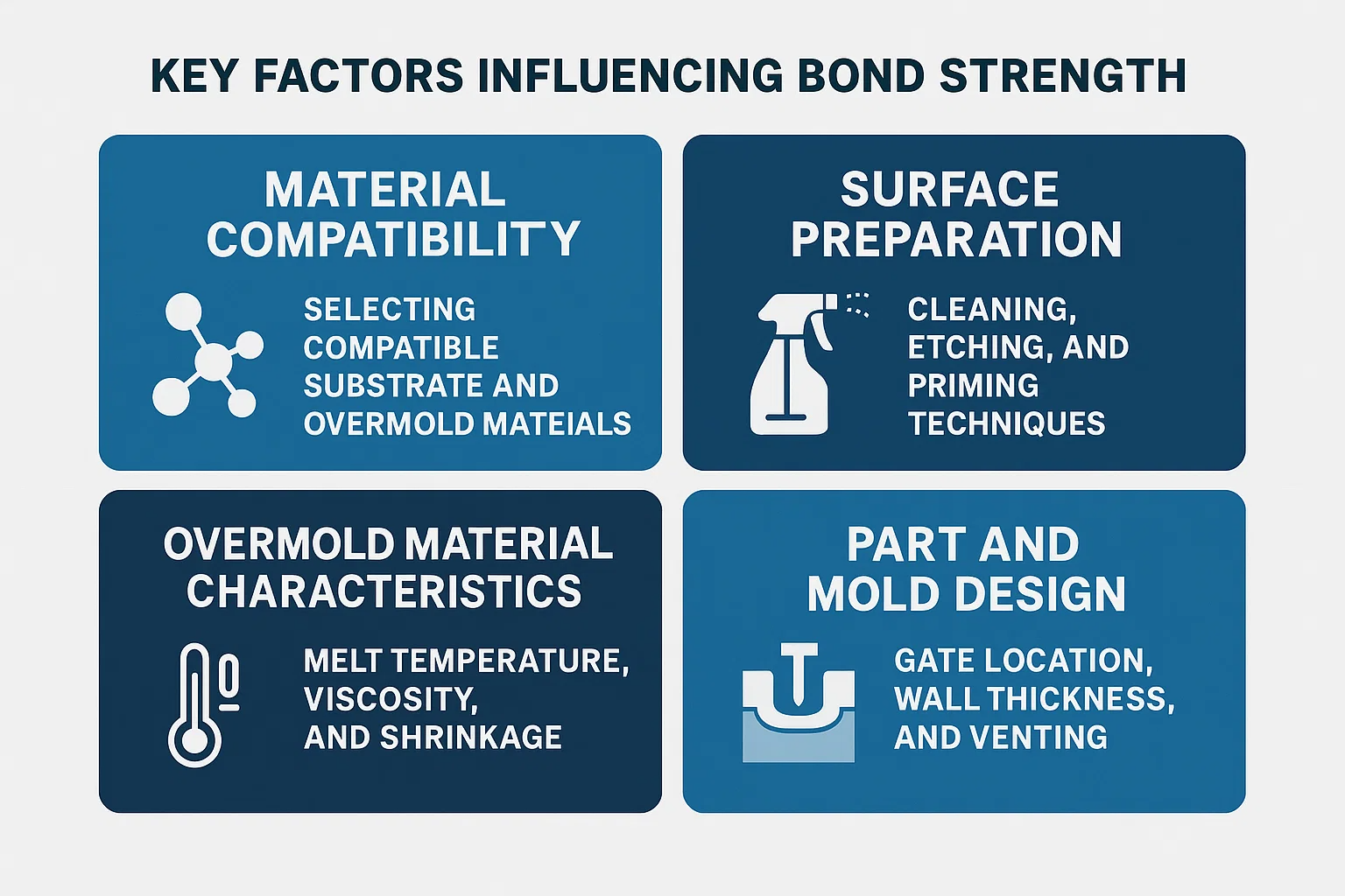 موقع البوابة: ال بوابة (حيث يدخل البلاستيك المنصهر في القالب) يجب وضعه استراتيجياً لضمان ملء تجويف Overmold وإكماله. يمكن أن يؤدي موقع بوابة ضعف البوابة إلى تعبئة غير مكتملة أو خطوط اللحام أو المناطق التي تعاني من ضغط غير كافٍ ، وكلها تسوية قوة الرابطة.