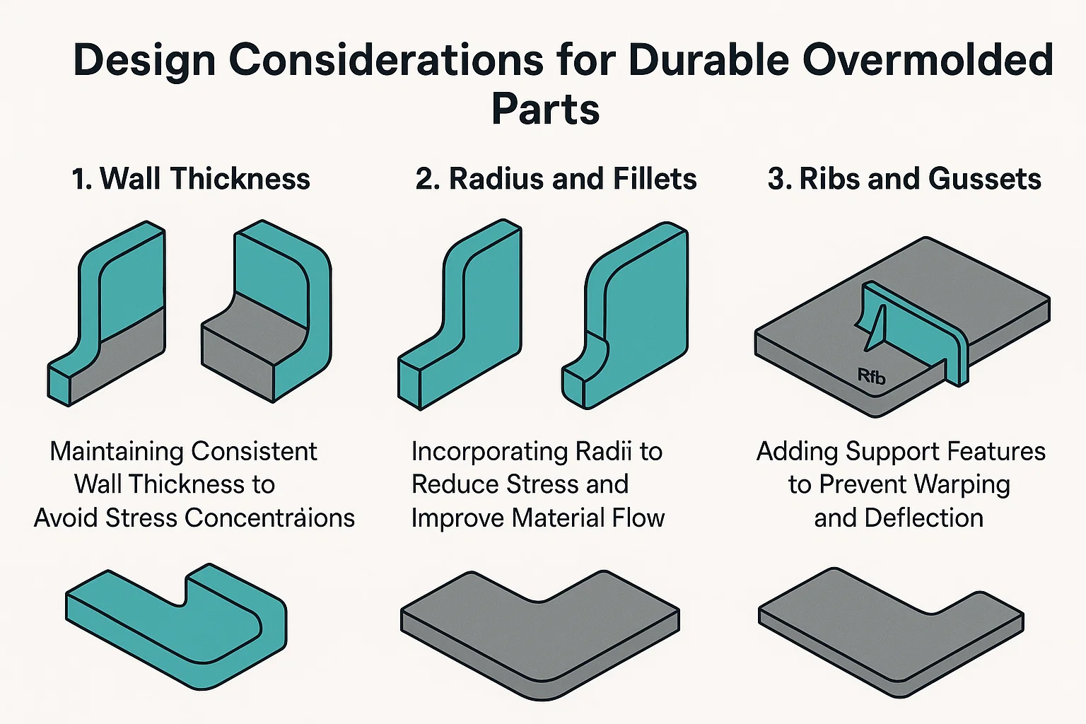 حل: صمم طبقة Overtmold مع سماكة جدار موحدة قدر الإمكان. إذا كانت الاختلافات في السماكة لا يمكن تجنبها بسبب هندسة جزء ، فقم بتنفيذ التحولات التدريجية (على سبيل المثال ، باستخدام TAPers الطويل ، بدلاً من الخطوات الحادة). هذا يسمح لمزيد من التبريد ويقلل من تركيزات الإجهاد في خط الرابطة.